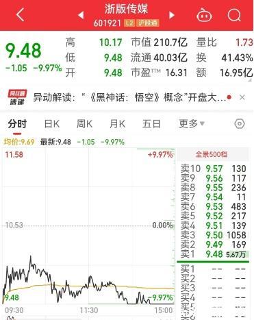 22日开盘,《黑神话:悟空》概念股持续走低。截至收盘,华谊兄弟跌超13%,浙版传媒跌停,国旅联合、致尚科技、山西高速、海信视像、中信出版等跟跌。